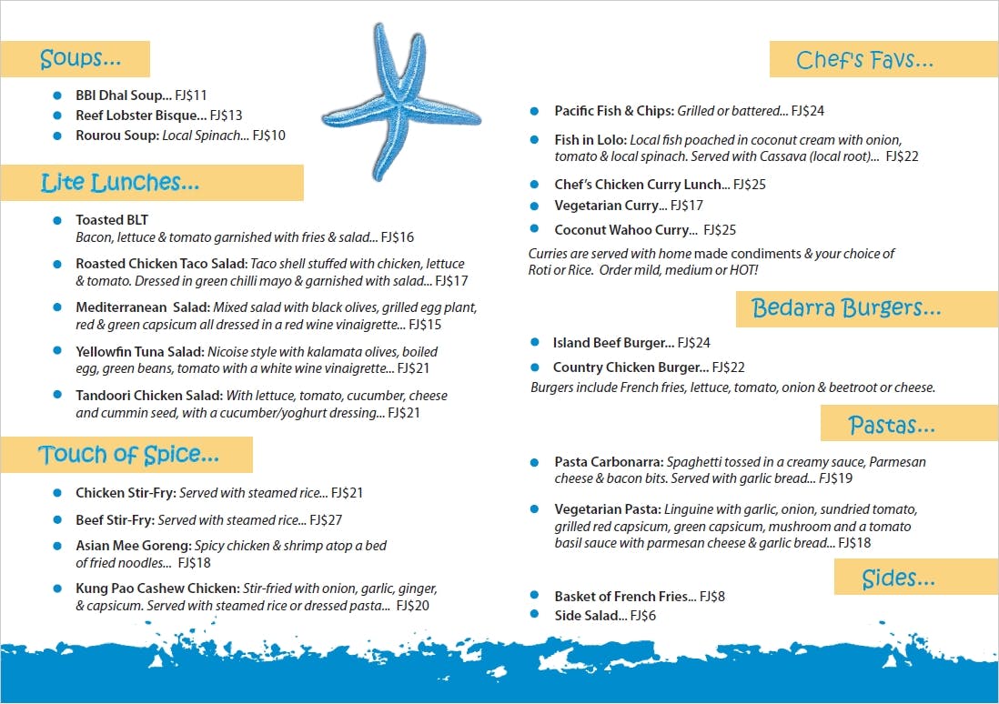 Cuisine at Bedarra Beach Inn - FijiLunch Menu Cuisine Breakfast Menu Lunch Menu Dinner Menu Cuisine at Bedarra Beach Inn - Fiji Cuisine Breakfast Menu Lunch Menu Dinner Menu